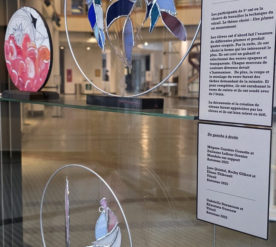 Les participants de 5e secondaire ont eu la chance de travailler la technique du vitrail. Le thème choisi : Une plume en mouvement.