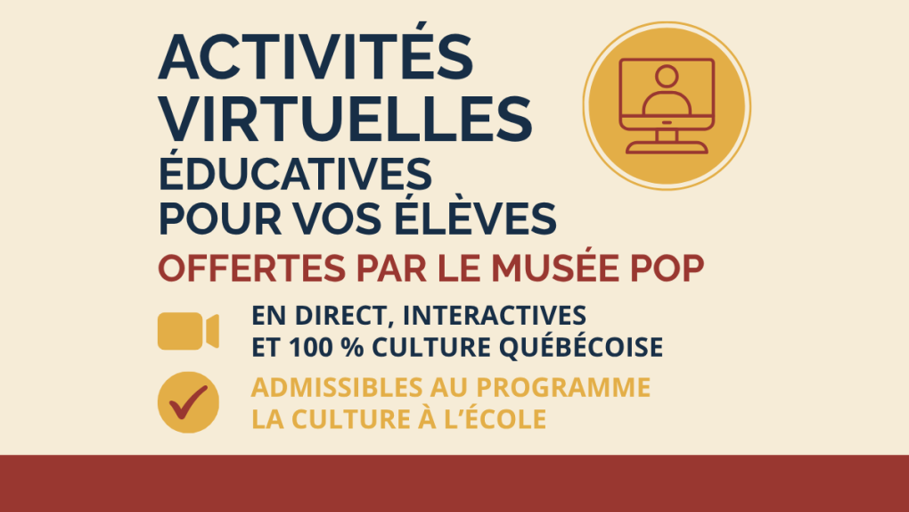 Le Musée POP, accrédité par le programme La culture à l’école, vous propose des animations virtuelles en direct, animées par nos médiateurs passionnés, conçues pour stimuler la curiosité, l’identité culturelle et le plaisir d’apprendre.